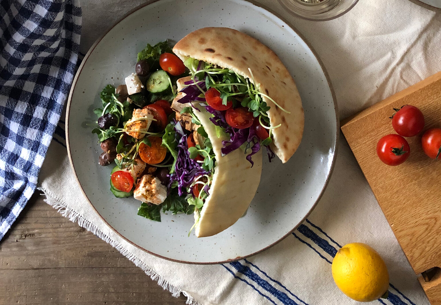 ハーブ&スパイスとレモンでマリネ後、グリルした徳島県産の阿波尾鶏と、フェタチーズのグリークサラダ、ヨーグルトソース、ピタパンなどがセットになっています。