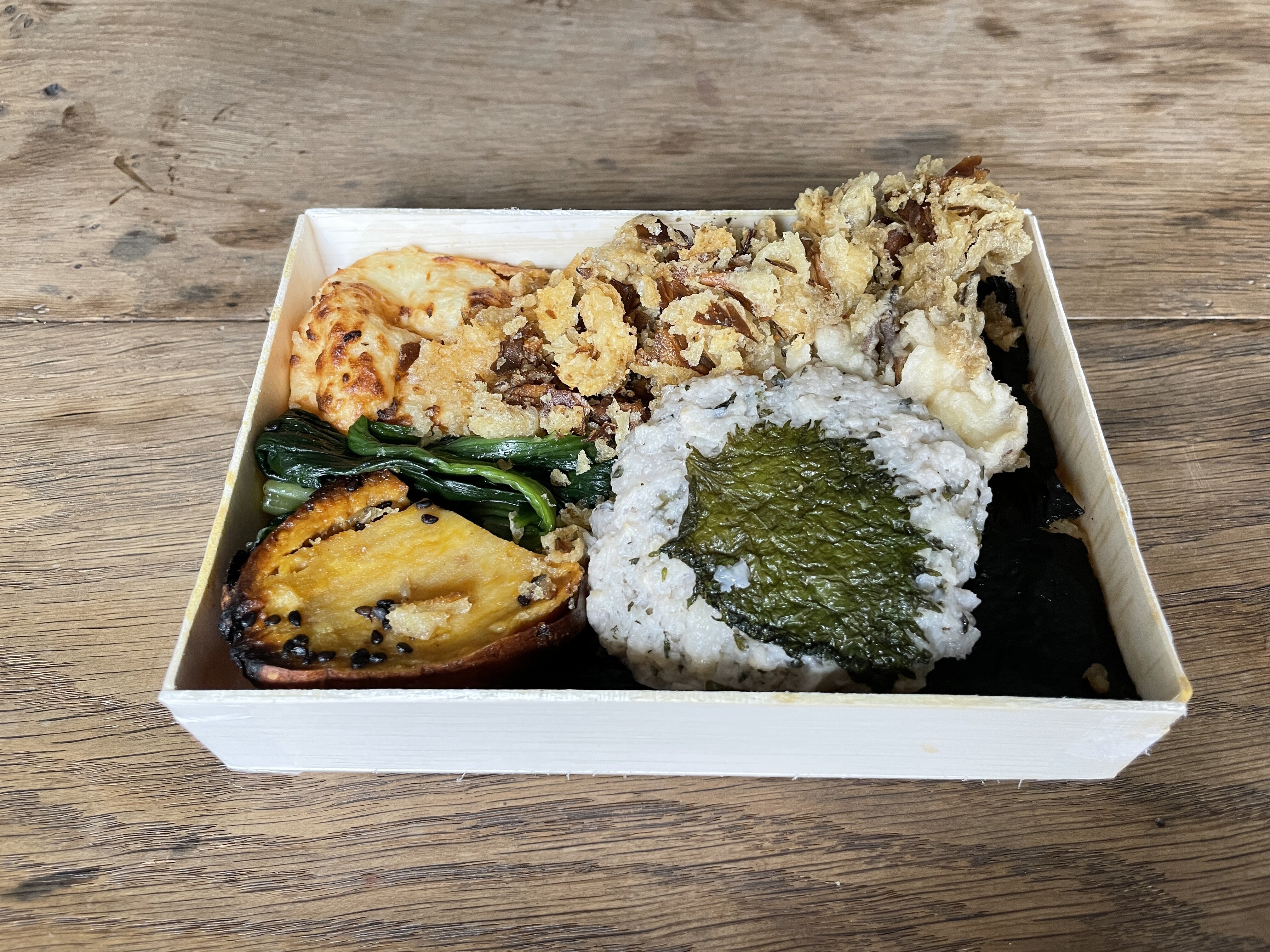 数種類ある海苔弁の中でも、私のお気に入りは、れんこん大葉もちや舞茸天ぷら、安納芋の大学芋など野菜の恵みたっぷりの「畑」。